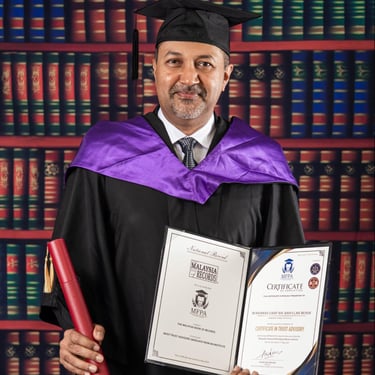 Dr. Zarif Menon’s academic and professional grounding includes a Bachelor of Laws (LLB) from the University of Wolverhampton, professional certification in financial planning and trust-related services through the Malaysian Financial Planning & Advisory Institute, and recognition at doctorate level in the area of Finance & Investment from the University of Thames, Paris, Frace. This combination of legal grounding, financial discipline, and strategic experience gives his work an unusually integrated foundation.